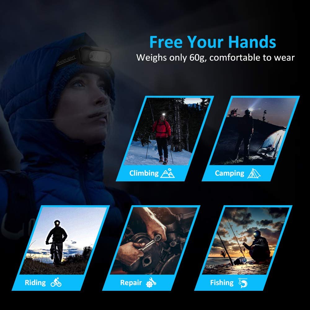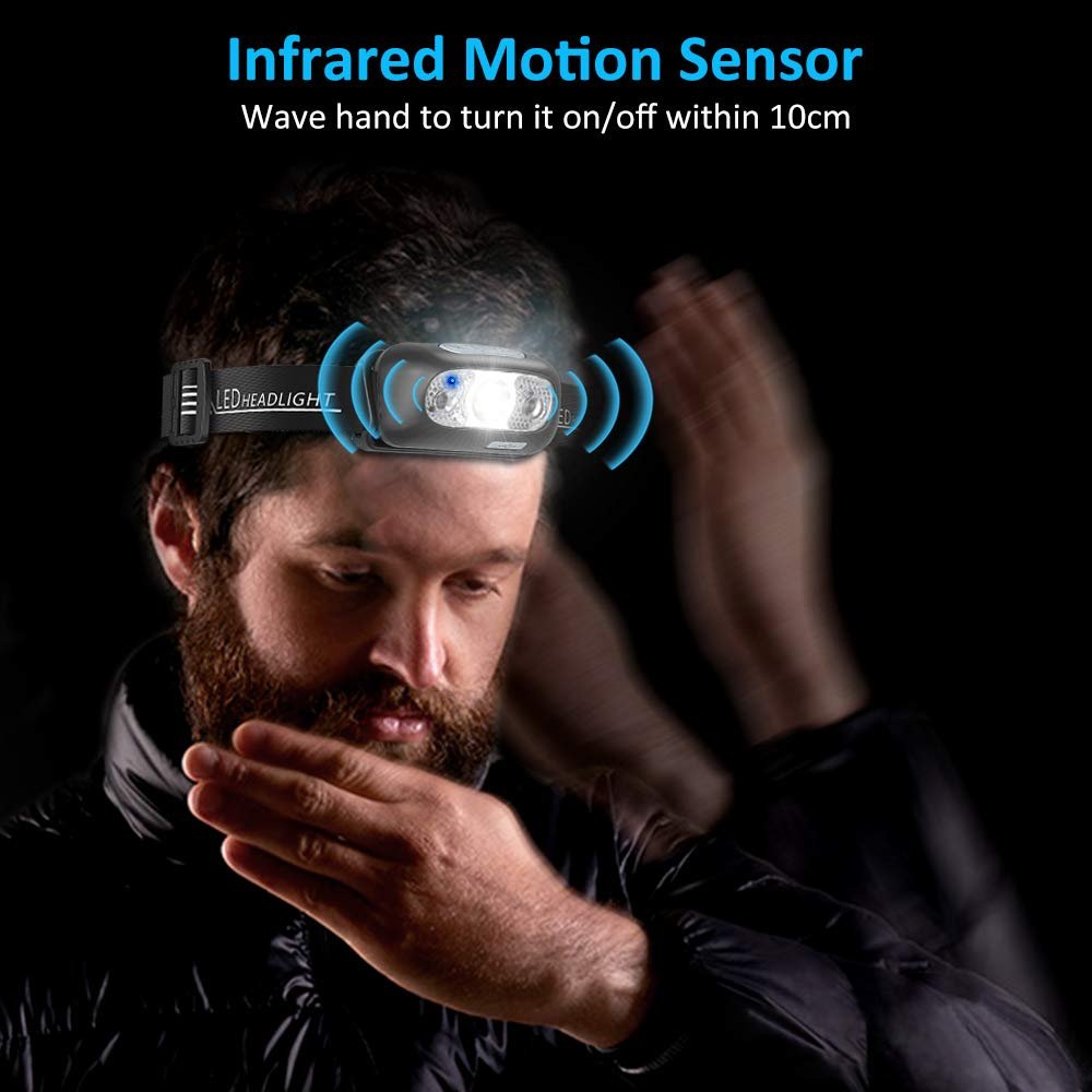 - ★Motion Sensor & Hands-Free — Features IR motion sensor, easily wave your hand in front of (within 10cm) the head torch to turn it off or on. Use this LED head torch instead of the handheld flashlight to keep your hands free, ideal for running, caving, biking, hunting, electrical work, auto parts repairing, and more.