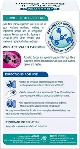 Dr. Beckmann service-it deep clean washing machine cleaner powder not only cleanses your machine but also kills 99.99 % of bacteria, viruses and fungi, leaving your washing machine hygienically clean and smelling fresh. Every time you wash deposits of dirt and detergent settle in your washing machine. This causes unpleasent damp smells and often mould on door seals and in detergent drawers. It is important to hygenically clean the the machine which helps you clean!
