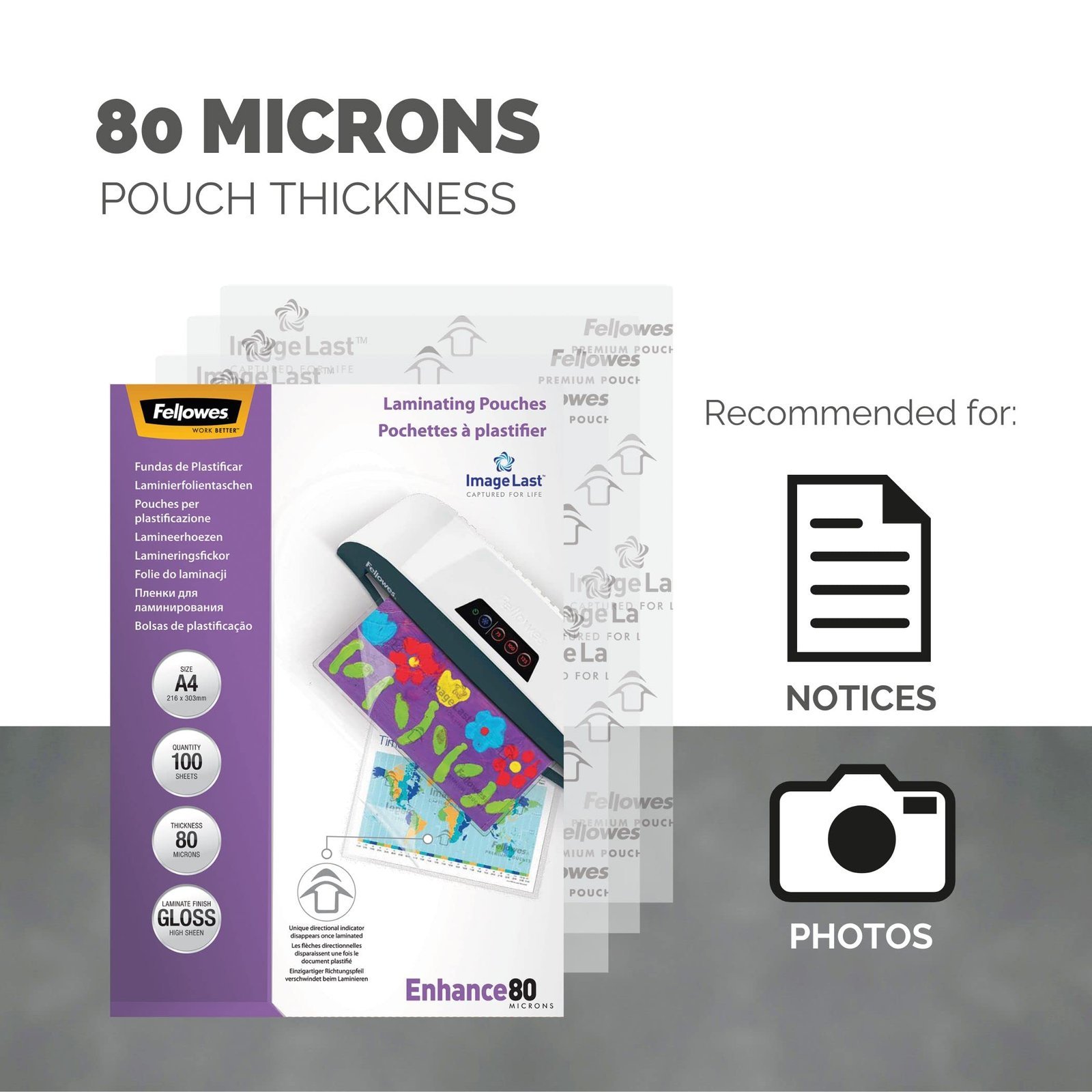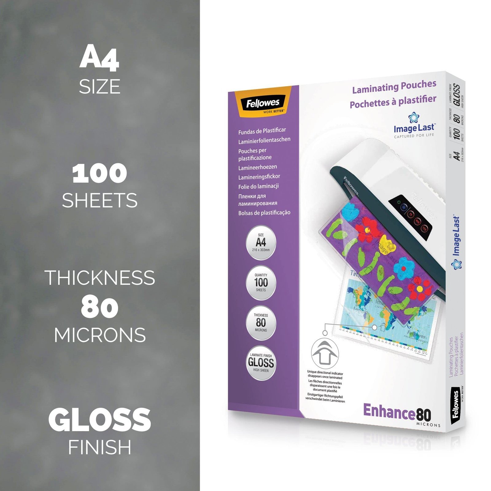 Fellowes A4 Laminating Pouches, Gloss, 80 Micron with Image Last Directional Quality Mark, Pack of 100, transparent