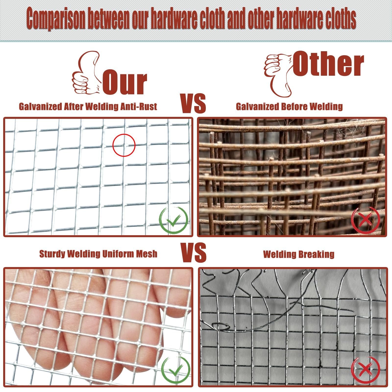 - Easy to Use: Our hardware cloth is very easy to use, you can use scissors to cut it directly to make any size you want, you can do chicken cage netting, rabbit cage netting, or you can use it in your broken areas to keep the mice away, great for DIY sizes, crafts and more!!! However, please note that the Galvanized Wire Mesh Roll is relatively sharp around the cut out area, please pay attention to safety to avoid cutting your fingers