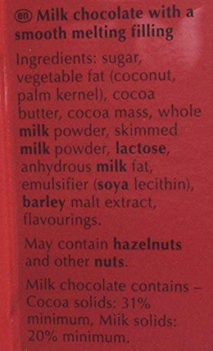 Sugar, vegetable fat (coconut, palm kernel), cocoa butter, cocoa mass, whole MILK powder, skimmed MILK powder, LACTOSE, anhydrous MILK fat, emulsifier (SOYA lecithin), BARLEY malt extract, flavourings. Milk chocolate contains: Cocoa solids: 32% min., Milk solids: 21% min. May contain HAZELNUTS and other NUTS