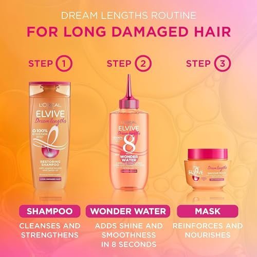WORKS WONDERS IN 8 SECONDS: Discover Dream Lengths 8 Second Wonder Water by L’Oreal Paris Elvive. This damaged hair treatment, in a rinse-out liquid conditioner formula, transforms lengths in just 8 seconds. Hair is 10x smoother*, with glassy shine and a silky touch. LAMELLAR TECHNOLOGY: Wonder Water is the next generation of hair deep conditioners and treatments as it has an ultra-lightweight formula powered by Lamellar Water technology. Moisturising agents and amino acids target dry, damaged areas of hair, forming thin layers called Lamella to smooth hair’s surface and visibly transform lengths in just 8 seconds. Hair is silkier, shinier and healthier-looking with an unbelievably weightless feel. EFFECTIVE ON MULTIPLE HAIR TYPES, IDEAL FOR LONG, DAMAGED, DRY, FRIZZY HAIR: Dream Lengths Wonder Water is a damaged hair treatment that’s effective on multiple hair types from fine to curly, but ideal for long hair that’s damaged, dry or frizzy. Wonder Water has a silicone-free formula which means no weigh-down even on hair that’s ultra-fine. Safe to use on colour treated hair. For best results use after Dream Lengths Shampoo, follow with Dream Lengths conditioner if needed. Blow dry for ultimate shine and smoothness! HOW TO USE: Dream Lengths Wonder Water is a rinse-out hair treatment. Use 2-3 times per week after shampooing with Dream Lengths Shampoo. Use 1 dose for fine to medium textured hair, 2-3 doses for thick to curly textured hair, add 1 more dose if you have extra-long hair. Apply directly to wet hair on the lengths only, avoiding the scalp. You may feel a slight warming sensation as the product activates. Massage for 8 seconds and rinse out. Use Dream Lengths Conditioner and No Haircut Cream Leave-in Conditioner after if needed. Blow-dry for even greater results! *instrumental test, 2019