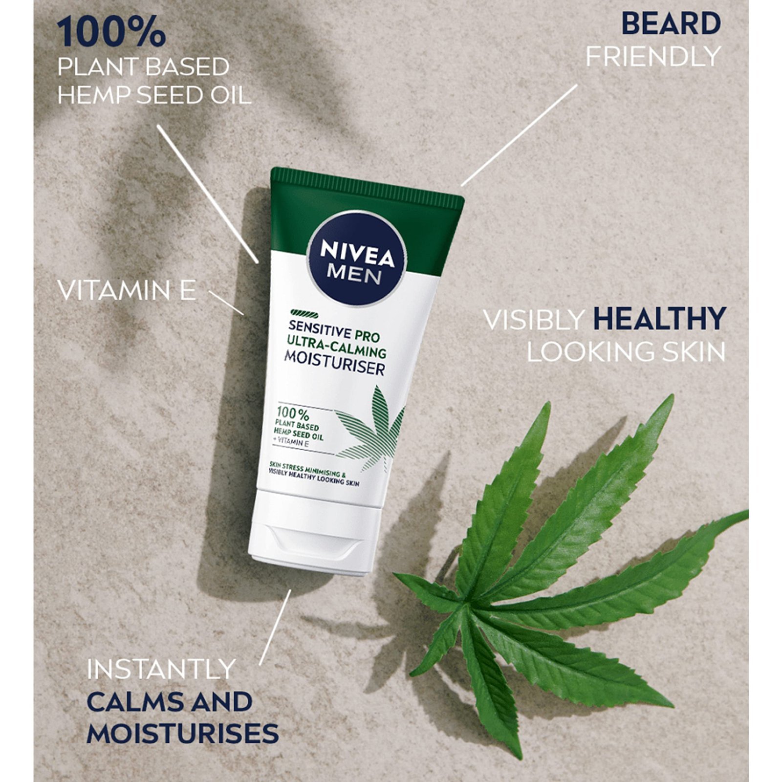 NIVEA MEN Sensitive Pro Ultra Calming Moisturising Cream – Minimise skin stress for visibily healthy looking skin Skin feeling dry and tight? Calm and hydrate your skin with NIVEA MEN’s Sensitive Pro Ultra Calming Moisturing Cream. Made with 100% plant based hemp seed oil and vitamin E, the light formula soothes and moisturises the skin to reduce dryness and irritation for up to 24 hours. The cream is fast absorbing meaning no oily feeling on the skin and is also beard friendly to keep facial hair from looking greasy. It’s not only good for your skin, but the vegan formula is microplastic free and is packaged in a folding box made of 90% recycled material to help protect the planet too. Dermatologically approved for sensitive skin. To apply: Wash face thoroughly and remove sunscreen or make up before using this moisturiser cream. Massage gently in and around all areas of the skin whilst taking care to avoid the eye area. Product benefits: • Ultra calming effect minimises skin stress • Visibly healthy looking skin • Organic hemp seed oil + vitamin E • Provides 24h hydration • Beard friendly • Non greasy, quick absorption • Microplastic free and vegan formula • Packaging from 90% recycled material