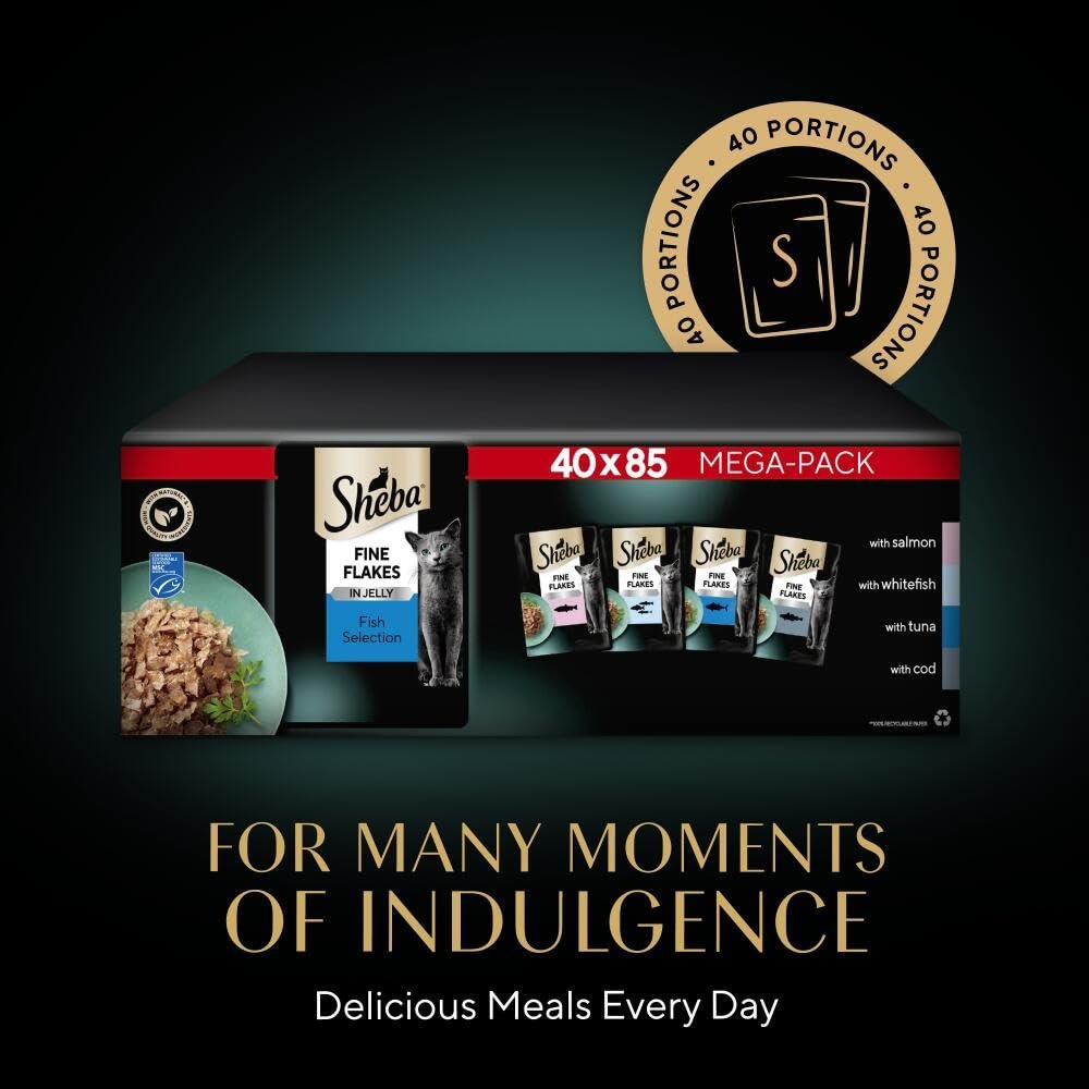 - Items delivered: 40 x 85 g Sheba Fine Flakes Fish Collection in Jelly / Multipack with fish variety / Suitable for any adult cat
