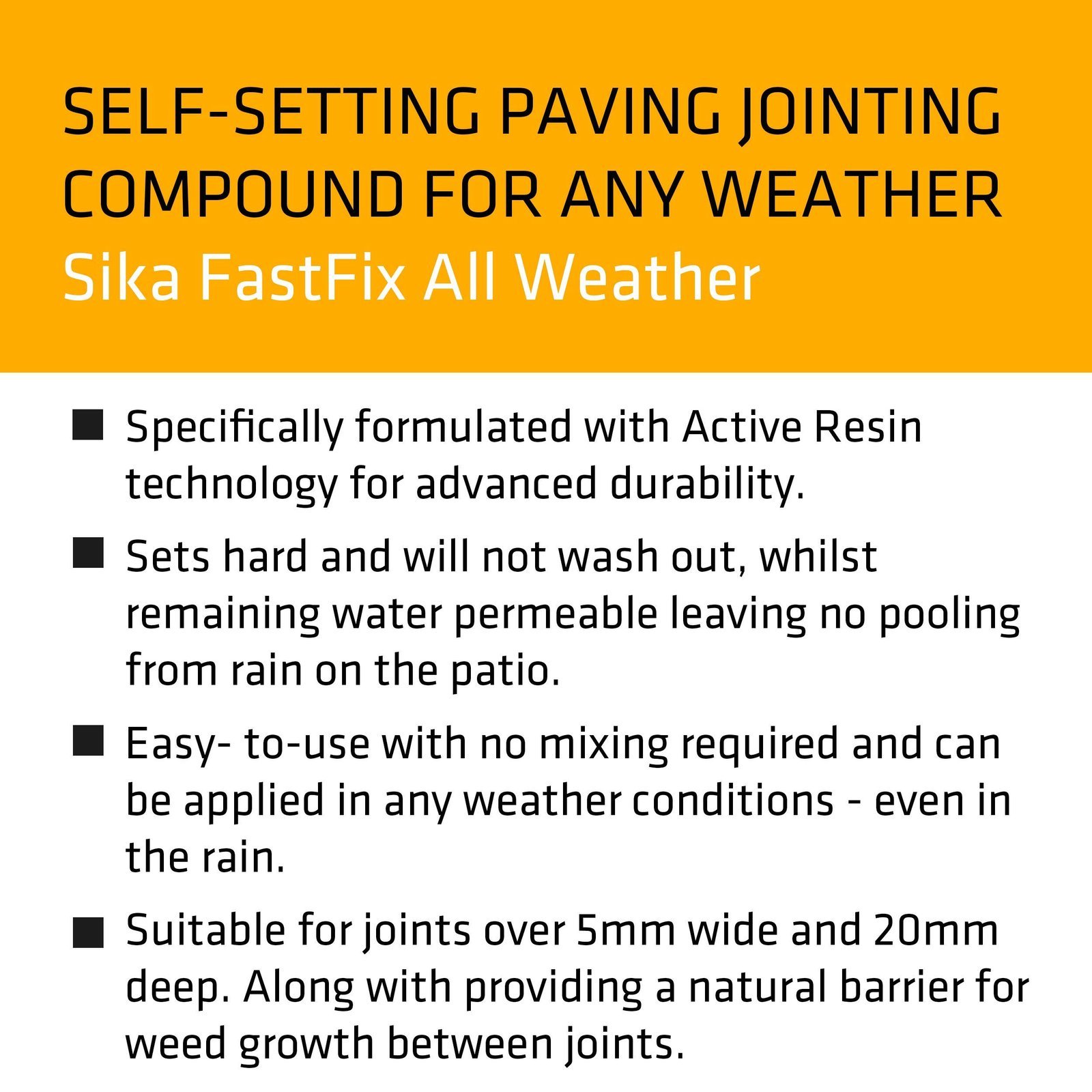Details: Sika FastFix All Weather is a self-setting paving jointing compound providing the ideal solution to perfect pointing on paving, paths and patios. With a unique formula containing Active Resin Technology for advanced durability, it is ready to use with no mixing required, easy to apply in all weather conditions; even in the rain and won’t shrink or crack over time. Suitable for use on all joints from just 20mm deep, Sika FastFix can be used for a range of applications including footpaths, stone setts, cobbles and Indian sandstone paving slabs and once opened can be stored in water and reused to reduce waste. Weed control – provides a tural barrier for weed growth Suitable for use on: Flagstones Cobbles Indian sandstone Stone setts Paving blocks Slabs Footpaths Patios Pavements Driveways with light vehicular traffic