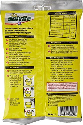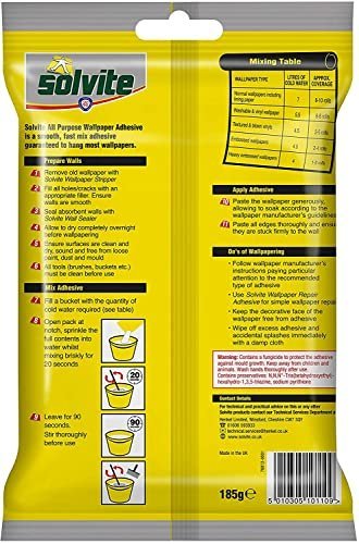 - Package Contents – Solvite All-Purpose Wallpaper Adhesive, wallpaper glue for wallcovering and wallpaper hanging projects, hangs up to 10 Rolls (1x185g Sachet)