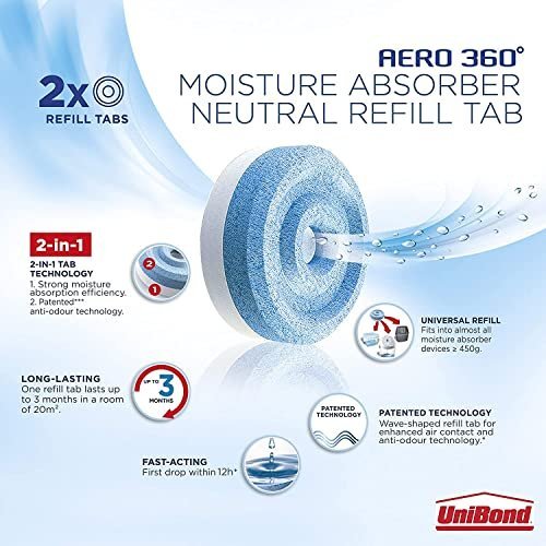 - 2-in-1 – Patented wave-shaped UniBond refill tab to maximise air circulation combined with ultra-absorbing active crystals and patented anti-odour agents to prevent damp problems and musty smells.