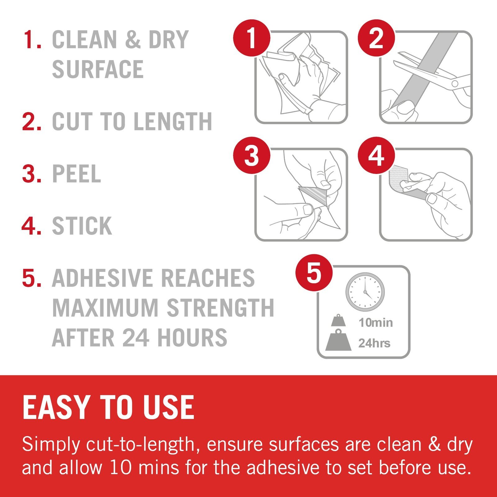 - CUT-TO-LENGTH – Simply cut the strong double sided tape into bespoke adhesive strips. Whether small for double sided carpet tape or into secure poster strips. Clean and dry both surfaces and allow 10 minutes for the self adhesive sticky strips to set.