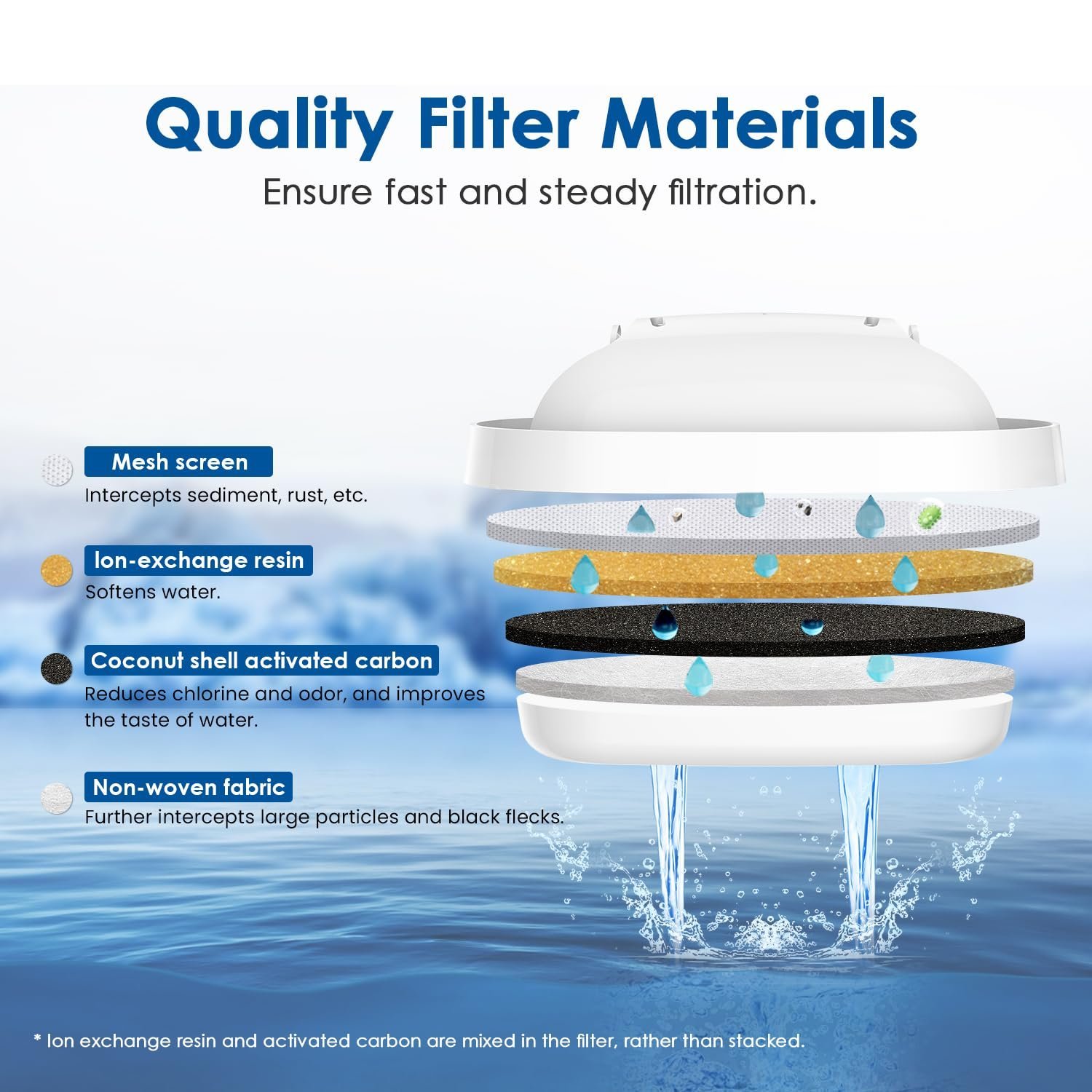 • Clean and Great Tasting: The premium ion-exchange resin and granular activated carbon used are effective in reducing chlorine, taste, odor, heavy metals and other potentially harmful contaminants in water, tested by a third lab